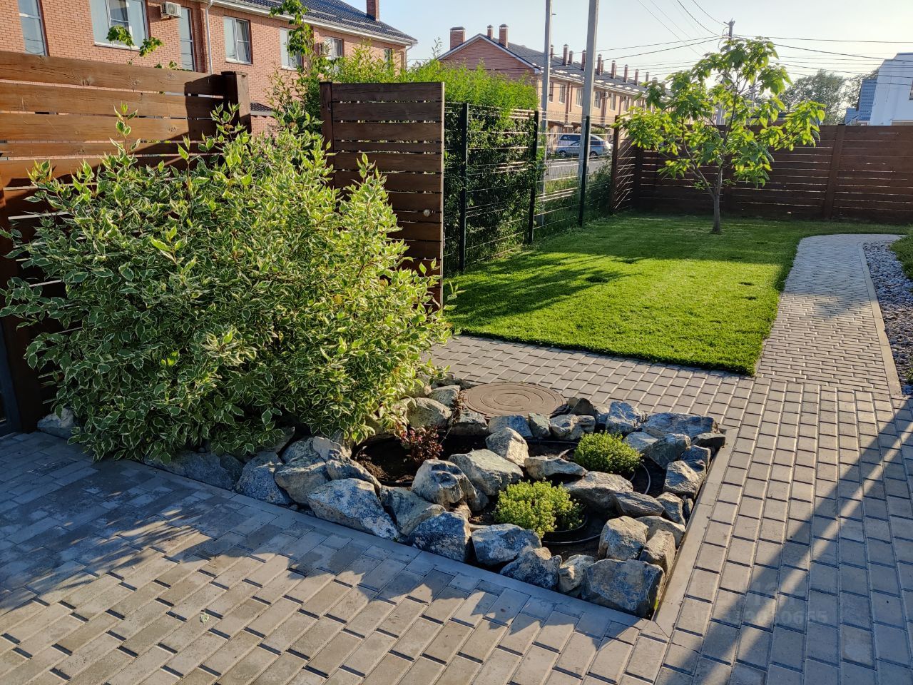 Уютный сад: Газон с автополивом, декоративные растения (розы, сирень, гибискус) и плодовые деревья (груша, абрикос, черешня).