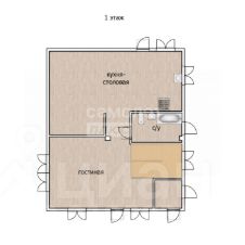 1 этаж - просторная гостиная, совмещенный санузел, кухня-столовая, площадью 34 кв. м.