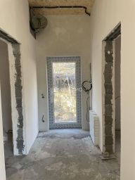 Предчистовая отделка,стены выровнены и готовы под покраску или поклейку обоев. Стяжка пола выровнена и подготовлена для укладки напольного покрытия. Так же монтаж системы тёплый пол. Фурнитура установлена турецкая. Современная планировка дома и удобное расположение комнат. Просторная кухня-гостиная 24 кв.м. Высокие потолки 3,80 м. Скважина 50 м. септик -4 кольца. Фундамент дома ленточный на сваях.