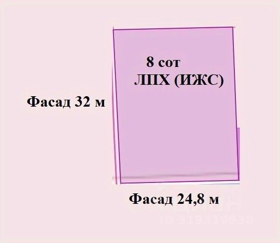 Участок угловой, ровный, прямоугольной формы, два фасада 32 м и 24,8 м.