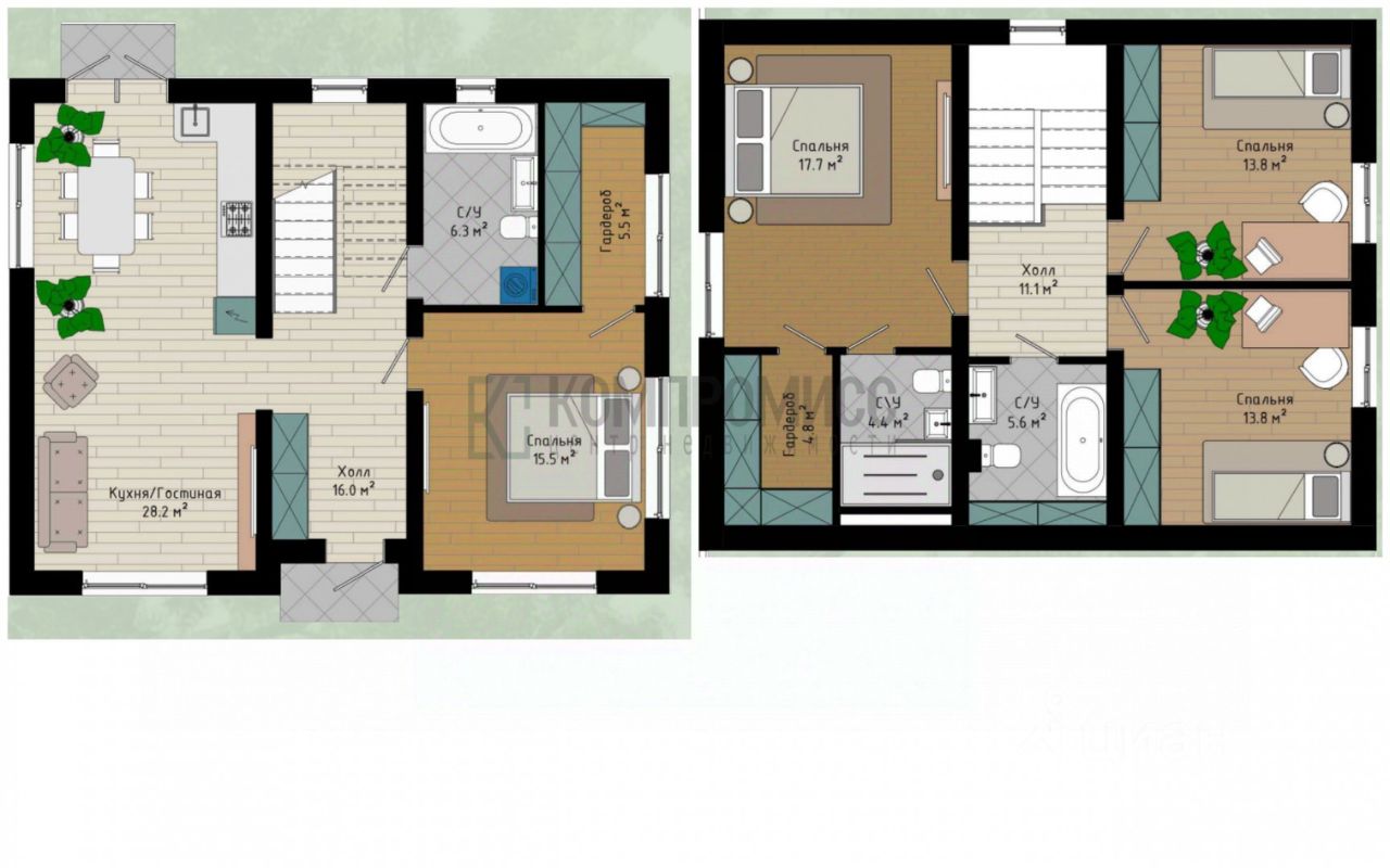 В доме: 4 спальни, кухня-гостиная, 3 сан.узла, 2 гардеробные, холл.