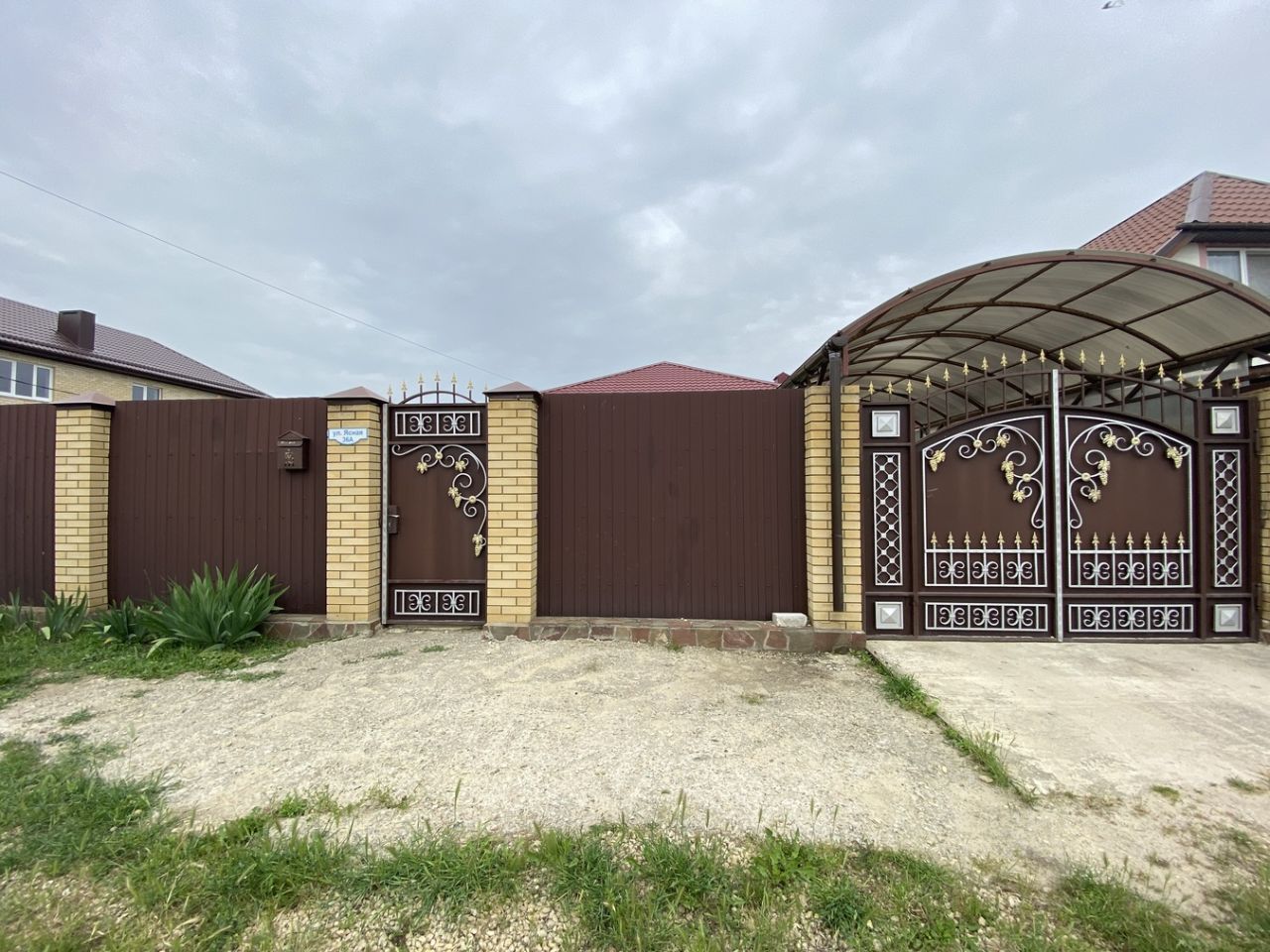 Забор по периметру керпичный, красивые металические ворота, все чистое и ухоженное.