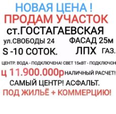 Продается шикарный земельный участок в центре ст. Гостагаевской. Участок можно использовать как для строительства частного дома, так и строительства зданий коммерческого назначения. Ровной, прямоугольной формы ( фасад 25 метров). Вода и свет заведены на участок, газ по меже. Шикарная локация с развитой инфраструктурой (садик, рынок, администрация, парк). Документы готовы к сделке. ЗВОНИТЕ!