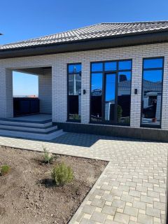 Установлен забор, участок в плитке, высажены растения. Раздвижные ворота, машиноместо