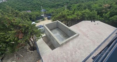 По периметру участка залиты подпорные стены и бассейн, выделена зона барбекю, есть место для бани.