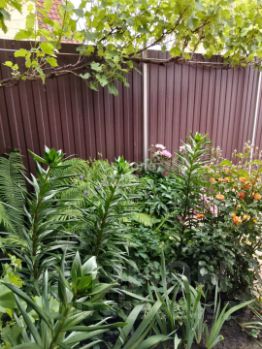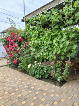 Двор вымощен тротуарной плиткой, есть два выхода и два навеса, которые можно использовать как веранды. Летом участок утопает в зелени, растут виноград, чернослив, алыча, груша, черешня и персик. На участке четыре лозы винограда, из которых можно делать вино. Также есть многолетние цветы, розы и газон.