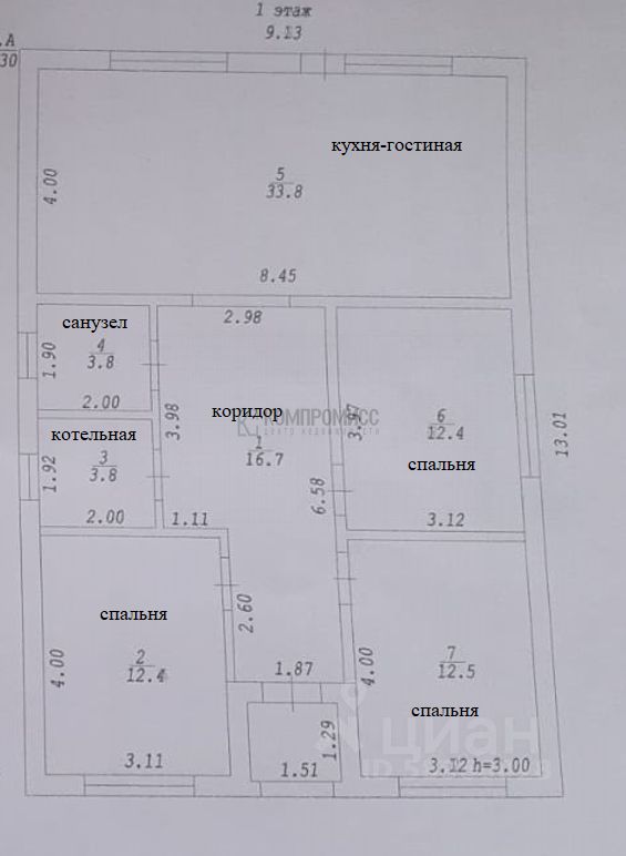 Площадь дома- 95.4 кв.м., с тремя изолированными жилыми комнатами, кухней- гостинной, просторным санузлом, котельной и коридором.