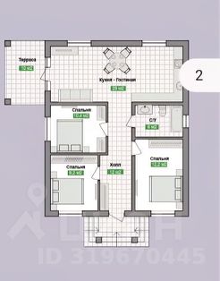 Планировка: кухня-гостиная 29 кв.м с выходом на террасу 10 кв.м., спальня 10,4 кв.м, спальня 9,2 кв.м, санузел 6 кв.м, спальня 12,2 кв.м, холл 12 кв.м. Входная группа (крыльцо).