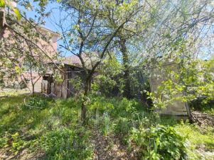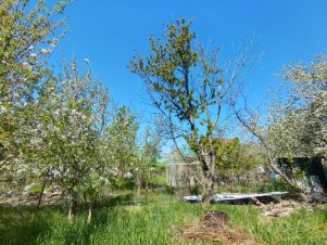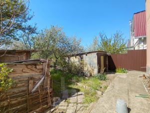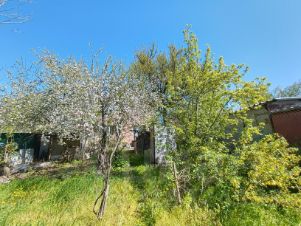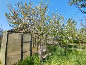 На заднем дворе расположен сад с плодовыми деревьями, установлена теплица.