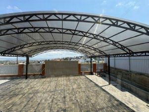 Выполнено благоустройство двора, во дворе брусчатка, установлен большой навес с подцветкой, для двух, трех автомобилей.