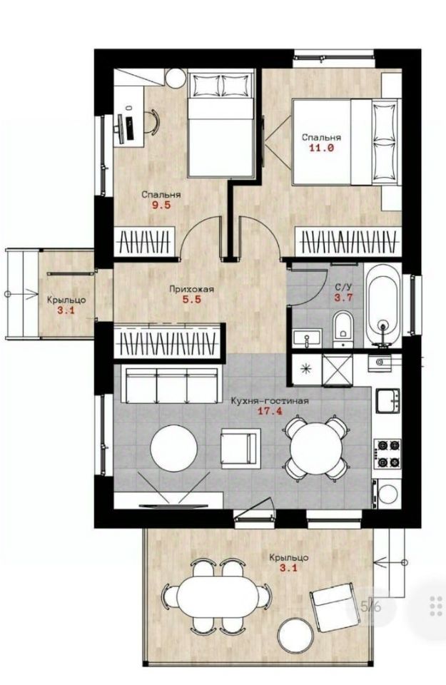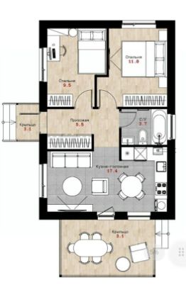 Практичная планировка: большая светлая гостиная-кухня с выходом на террасу станет центром семейного общения и приема гостей. Две отдельные комнаты обеспечат каждому члену семьи личное пространство.