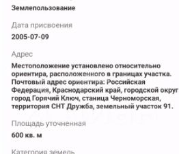 Продам земельный участок площадью 6 соток, расположенного в границах Горячеключевского района СНТ "Дружба". Участок правильной конфигурации. Кадастровый номер участка 23:41:0601001:462. Категория земель- земли сельскохозяйственного назначения. Разрешенное использование -для садоводства. Документы готовы к сделке