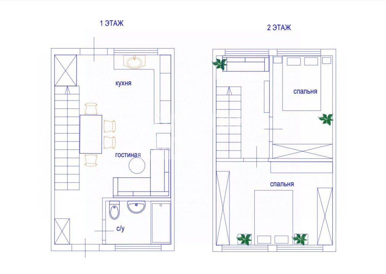 Первый этаж кухня-гостиная, санузел. Второй этаж - две комнаты. Черновая отделка, на полу стяжка.