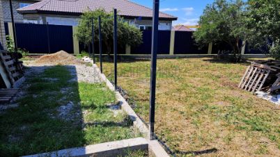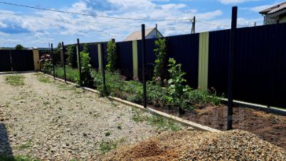 огорожен забором из металлического профиля на армированном фундаменте, с фасада забор из евроштакетника на кирпичных столбах;