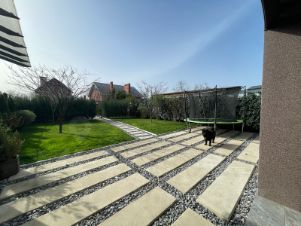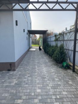 Отделка двора на полу во дворе и перед домом прессованная тротуарная плитка + ж/б плиты + колотый гранит.