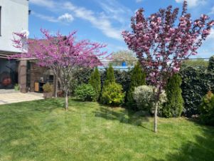 Ландшафт голубые ели, большое количество туй и можевельников разных видов, церсисы, магнолии, сакура, многообразие роз, лиственные кустарники, вечнозеленый забор по обоим межам от соседей из плюща и др. Плодовые сад яблони, инжир, клубника.