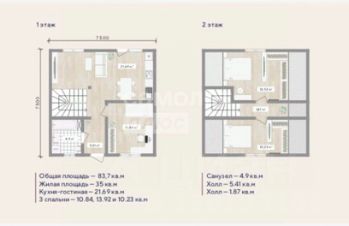 На первом этаже — кухня-гостиная с выходом на террасу, совмещенный санузел и отдельная спальня. На втором этаже две изолированные спальни. В доме установлены теплый пол на первом этаже и радиаторы на втором.