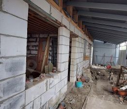 в котором планировалось построить отдельную кухню, ванную, быт.комната и хоз.комната (на данном этапе сделана коробка под крышей, заведена вода на кухню и заложена канализация с бетонированными полами. Осталось поставить окна двери и косметический ремонт для себя.