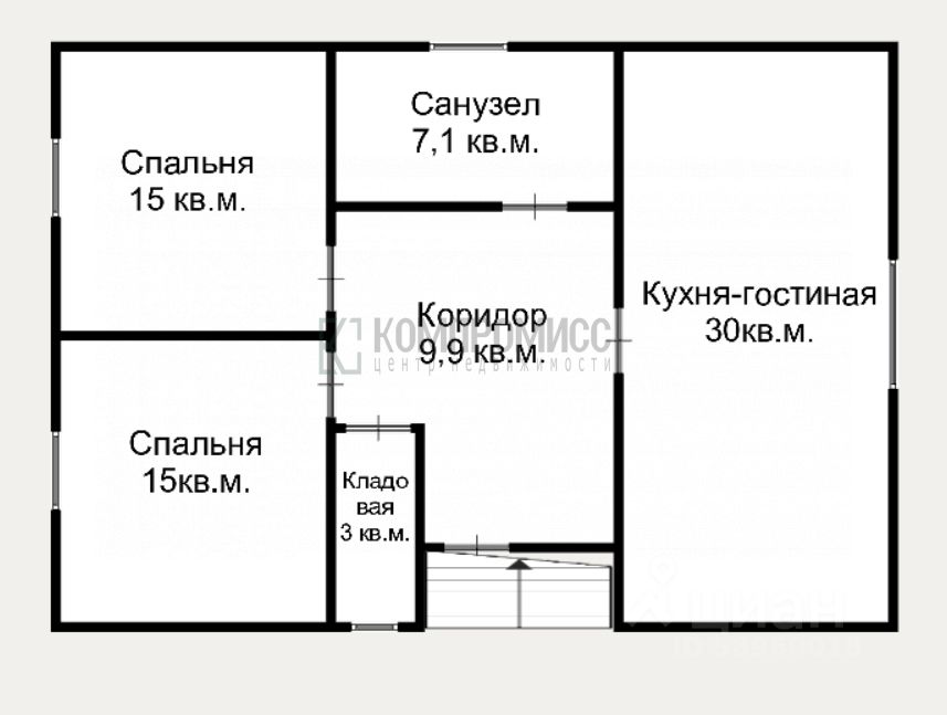 В доме: две изолированные спальни, просторная кухня-гостиная с выходом на участок, кладовая-котельная, коридор, совмещенный санузел.