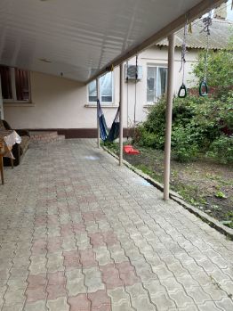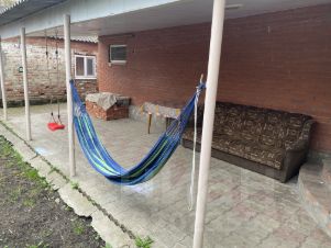Имеется хороший навес 10х4 м ( шиферный, подбитый потолок внутри пластиком), с гамаком и детскими качелями Дом обложен уличной плиткой
