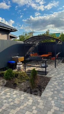 Отдельный двор вымощен тротуарной плиткой и укомплектован мангальной зоной и беседкой.