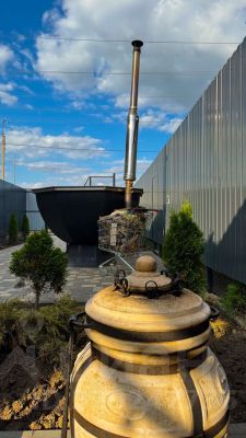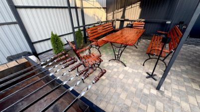 Двор вымощен тротуарной плиткой. На территории находится: беседка, мангальная зона, банный чан, зона отдыха с садовой мебелью.