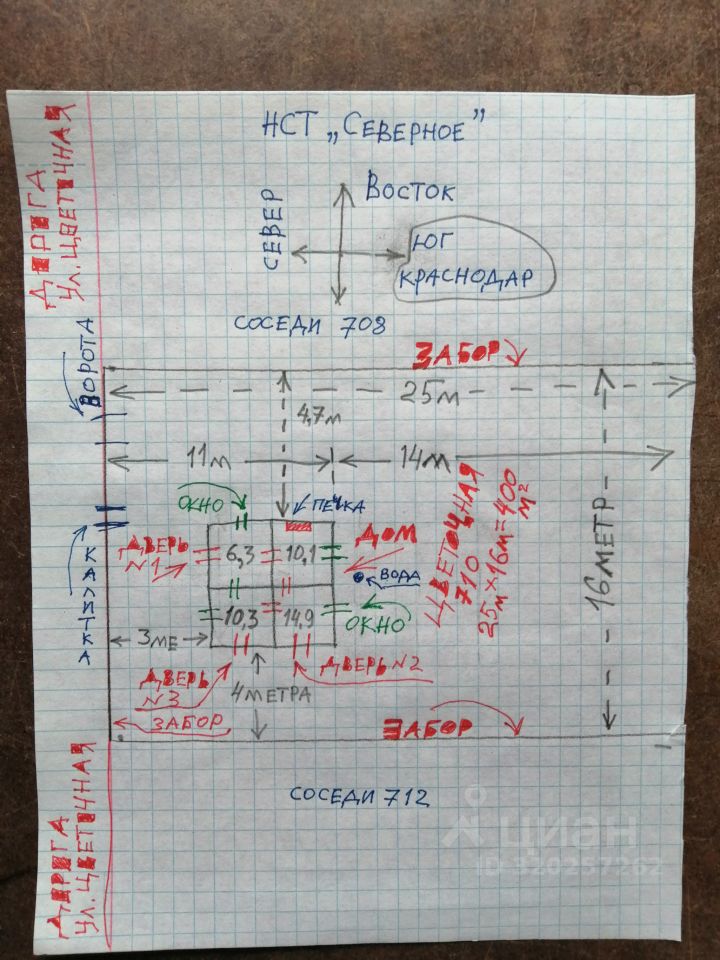 Прописка Прикубанского окр. г. Краснодара (если купите долю, часть дачи) . Было бы в два раза дешевле, но пропорция доли дома должна обязательно равняться пропорции доли территории . Рыночная стоимость пустых участков 4 сотки - 3 млн. руб. НИ КАКИХ АВАНСОВ ИЛИ ЗАДАТКОВ, придоплат мне не нужно; деньги только полностью,передаются продавцу ТОЛЬКО В КАБИНЕТЕ НОТАРИУСА, В ПРИСУТСТВИИ НОТАРИУСА во время составления договора о купле - продаже и составлении расписки о получении продавцом денег. 1)Первый вариант. Продаю комнату 14, 9кв. метров + 145 кв. метров земли это 36% дачи За 1,0 милиона рублей. Остальное можете достроить сами. 2) Или : Продаю долю 3/5 или 61% (полностью дом 41,6 кв. метров, земля 4 сотки) : 2, 46 сотки земли+ комната 14,9м. квадратных +комната 10,3 кв. м. За 1,7 милиона рублей. 3) Или комнату 10,3 + доля земли 1 сотка, за 700 тыс рублей. ОТПРАВЬТЕ СМС вначале , я перезвоню. Детский капитал не подойдёт, вообще нет туалета и душа ( а они возможно обязательно нужны внутри дома ) 2 входа со двора в каждую комнату отдельные от другой половины дома, у которой ещё 1 (третья) дверь на улицу. Высота потолка везде 2,5 метра Чердак утеплён пенопластом. ПЕЧКА В РЕМОНТЕ . ГАЗ под каждой дорогой улиц. Скважина, ручная колонка. Электричество. Стены - кирпич красный , два ряда, 25 сантиметров. Автобусы через 15 мин. Остановка, 10 мин. ходьбы, воздушный переход. Отдельный школьный автобус. До гипер Магнита, микрорайона Витаминкомбинат, 2 остановки. В НСТ несколько магазинов. Почти всё нст застроено. Краснодар, Прикубанский округ. НСТ Северное, ул. Цветочная 710 Алексей. Оштукатурены стены гипсом, отшлифовано. На потолок лучше наклеить обои. На полу линолиум новый. Потолок ровный листовой плоский шифер, со стороны чердака на плоском шифере пенопласт толщиной 4 см. Основание снизу досок пола и сверху плоского шифера потолка балки деревянные сечением 200 200 мм. Евро окно 1 штука, второе деревянное. На окнах решотки железные. Две входные двери, железные. Внутри засовы. На половине земли , яблони, груши, черёмуха, унаби. Другая 1/2 территории огород. Сараев нет, только дом. Трещин в стенах нет. Место самое высокое. Вначале ОТПРАВЬТЕ СМС, я перезвоню.
