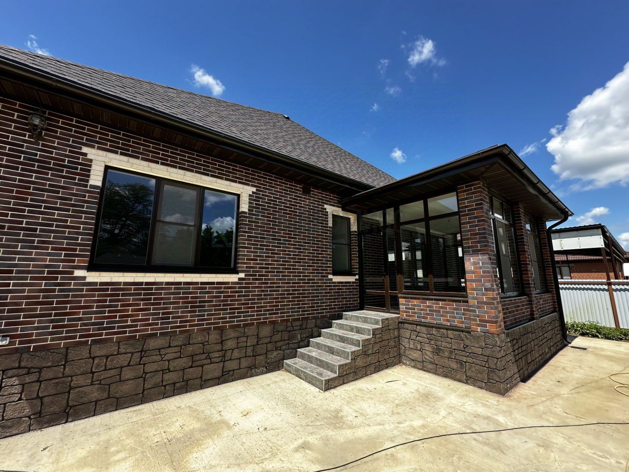 Дом выполнен полностью из кирпича. Внутренние стены в 1.5 забутовочного кирпича, утеплитель и облицовочный керамический кирпич. Отделка цоколя выполнена печатным бетоном.