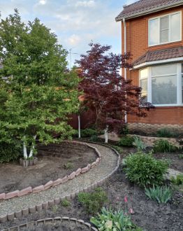 Плодоносящий молодой сад, ухоженный огород и теплица.