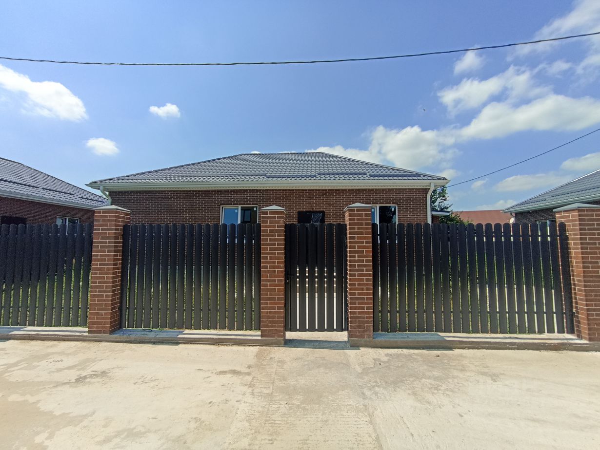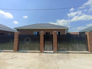 По периметру дом огорожен забором ,по фасаду капитальные кирпичные колонны и забор из Евроштакетника.