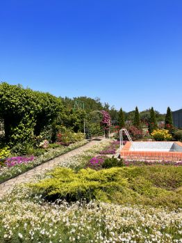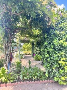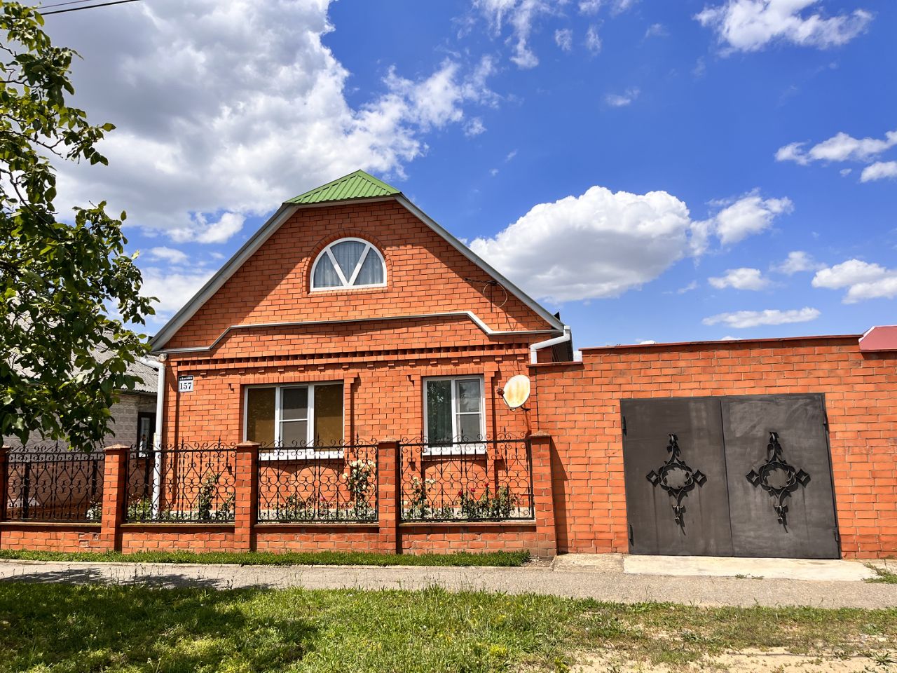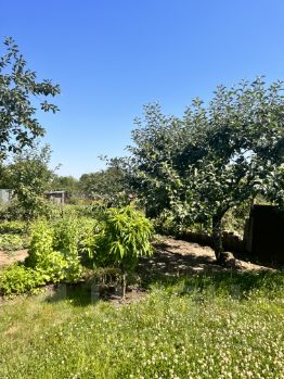 На территории ухоженный сад с плодовыми деревьями и кустами, шикарным цветником, а также зоной отдыха с небольшим бассейном. Для автомобилей предусмотрен гараж и есть место для второй машины как внутри участка, так и перед домом. В гараже есть ремонтная яма. Подключено газовое отопление, водоснабжение осуществляется через скважину, канализация центральная.