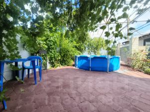 • Благоустройство: Двор вымощен тротуарной плиткой, установлен навес, растут виноградники.