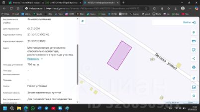 Площадь участка - 766 квадратных метров. Фасад - 18 метров. Категория земель - земли населённых пунктов. Вид разрешённого использования - для садоводства и огородничества.