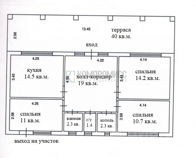 В доме- 3 спальни, кухня, санузел, ванная комната, котельная, просторный коридор- холл, терраса 40 кв.м. (во всю длину дома).