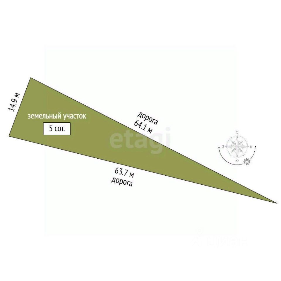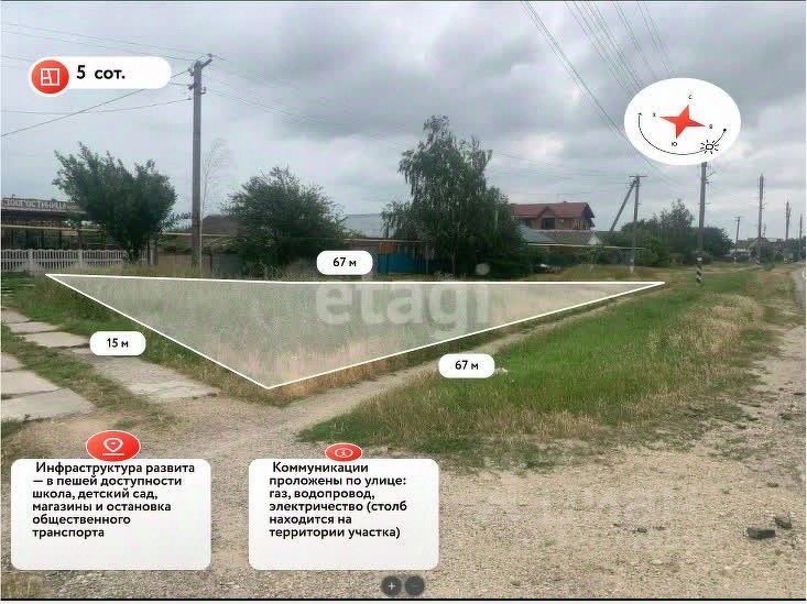 Участок площадью 5 соток расположен в станице Курчанской, в выгодном месте между двумя улицами с удобными подъездными путями. Треугольная форма участка с фасадами 67 м, 67 м и 15 м позволяет рационально использовать пространство под застройку или коммерческую деятельность.