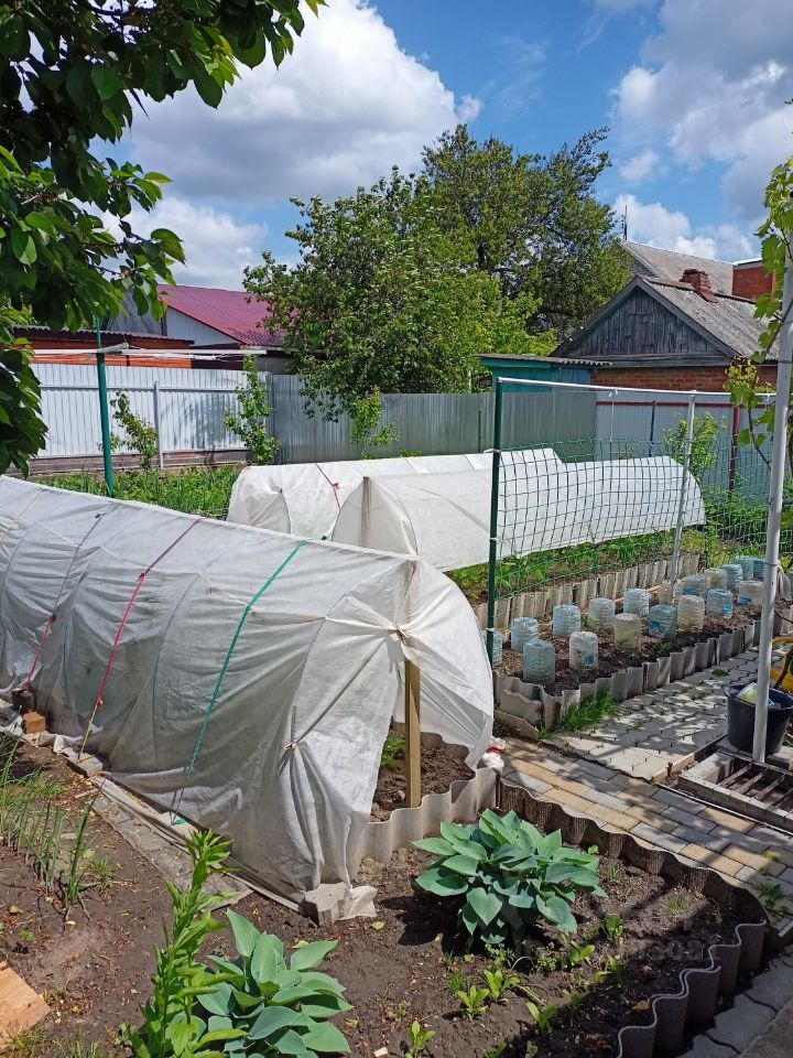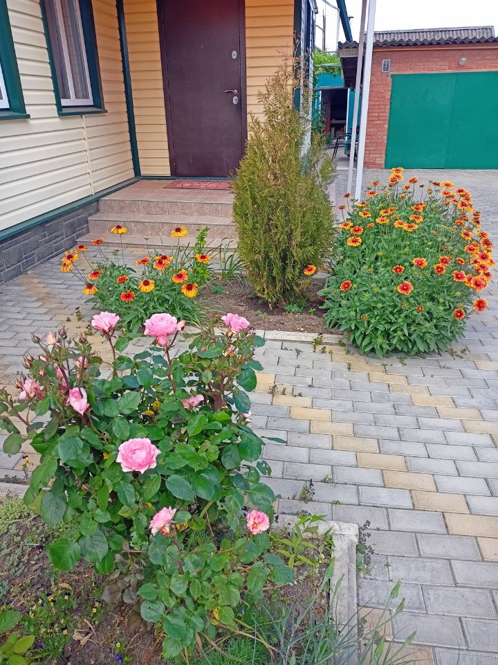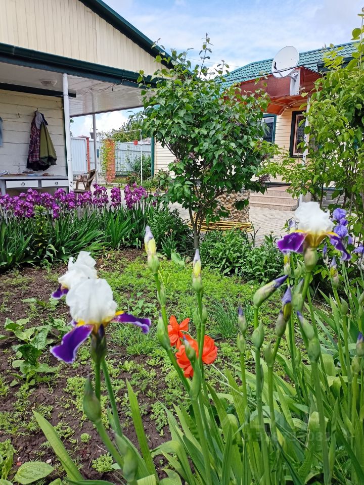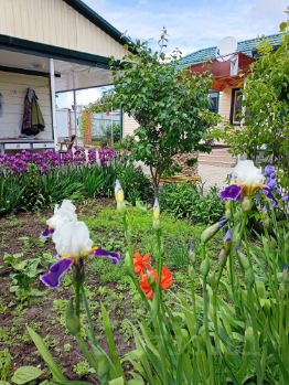 абрикос, груша, хурма, персик, инжир и разные ягодные кустарники. А также декоративные, цветы и несколько парниковых грядок.