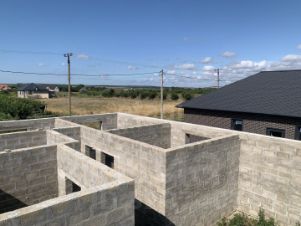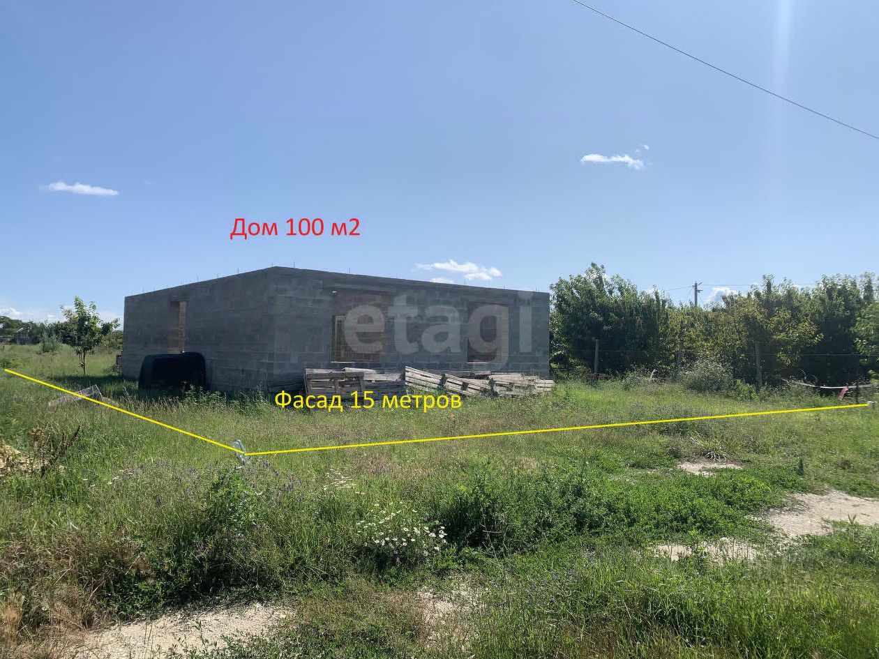 На участке начато строительство капитального дома площадью 100 кв.м. По проекту в доме располагаются 3 спальные комнаты, кухня-гостинная, совмещённый санузел и прихожая-котельная. Фундамент дома бетонная заливка, стены блок. Стены первого этажа выполнены на 100% и залит армопояс, есть возможность возвести второй этаж.
