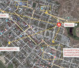 Школа 2 — 700 м;Детский сад 5 — 650 м;Терлецкий рынок — 800 м;Магазин "Магнит" — 600 м;Районная больница — 900 м.