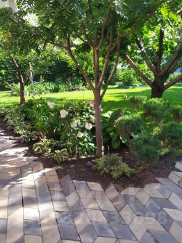 Ухоженный земельный участок с многолетним спортивным газоном, декоративными деревьями, кустарниками и цветами.