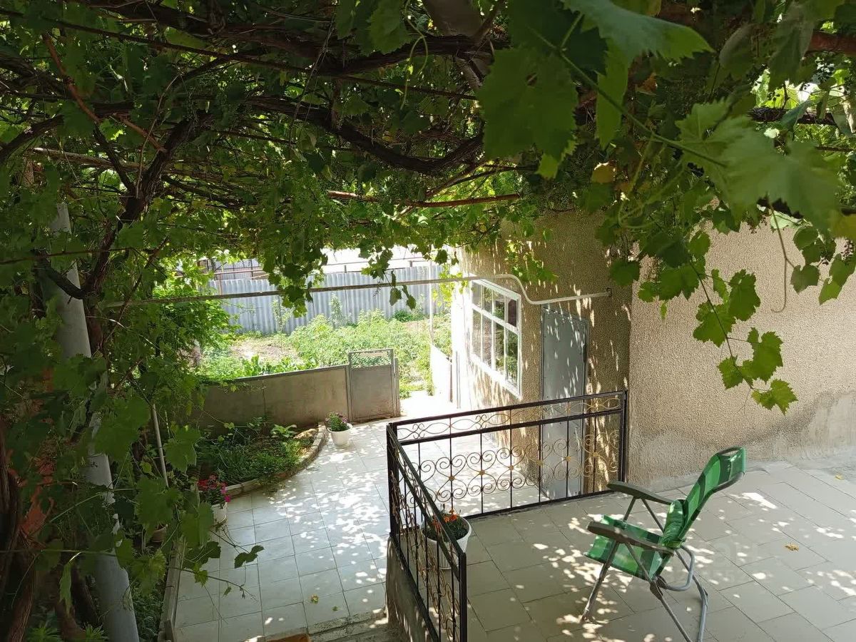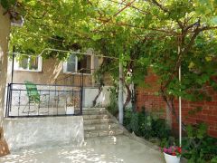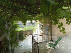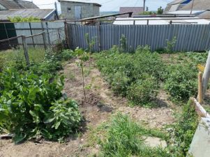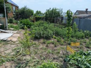 Участок засажен молодым фруктовым садом, придомовая территория выложена плиткой, двор защищен навесом из плодоносящего винограда. Помимо основного дома, на территории есть летняя кухня, новая баня и гараж на одну машину.