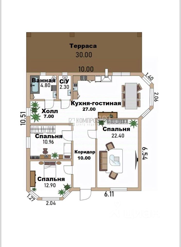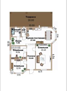 На первом этаже площадь 97,4 кв.м: три изолированные спальни, кухня-гостиная с солнечным эркером и с выходом на террасу (30 кв.м.), раздельный санузел, удобный и просторный коридор. Мансардный этаж без отделки, площадью 100 кв.м.