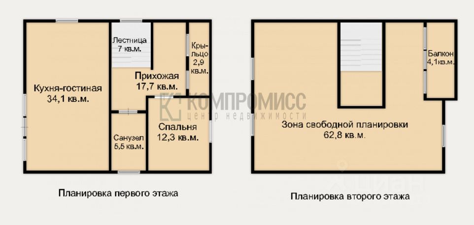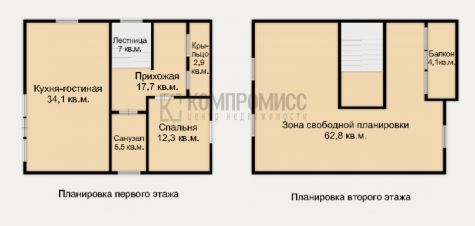 На первом этаже: 2 изолированных комнаты, просторная кухня-гостиная, коридор, санузел, прихожая.