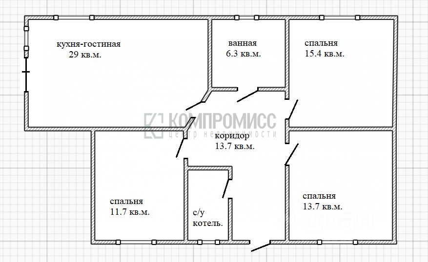 Площадь дома- 98.5 кв.м., содержит 3 спальни, кухня гостинная, ванная комната, котельная с санузлом, коридор.