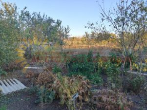 на большом участке много плодовых деревьев (персики, яблони, груши, черешня, абрикос и много еще чего), крыжовник, смородина, малина, виноград. Есть теплица, скважина для полива;