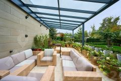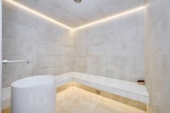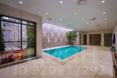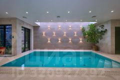 Из гостиной есть выход в крытую зону отдыха площадью 85 кв метров, где расположен бассейн с системой подогрева и рециркуляции, зона SPA с турецким хаммом и сауной.