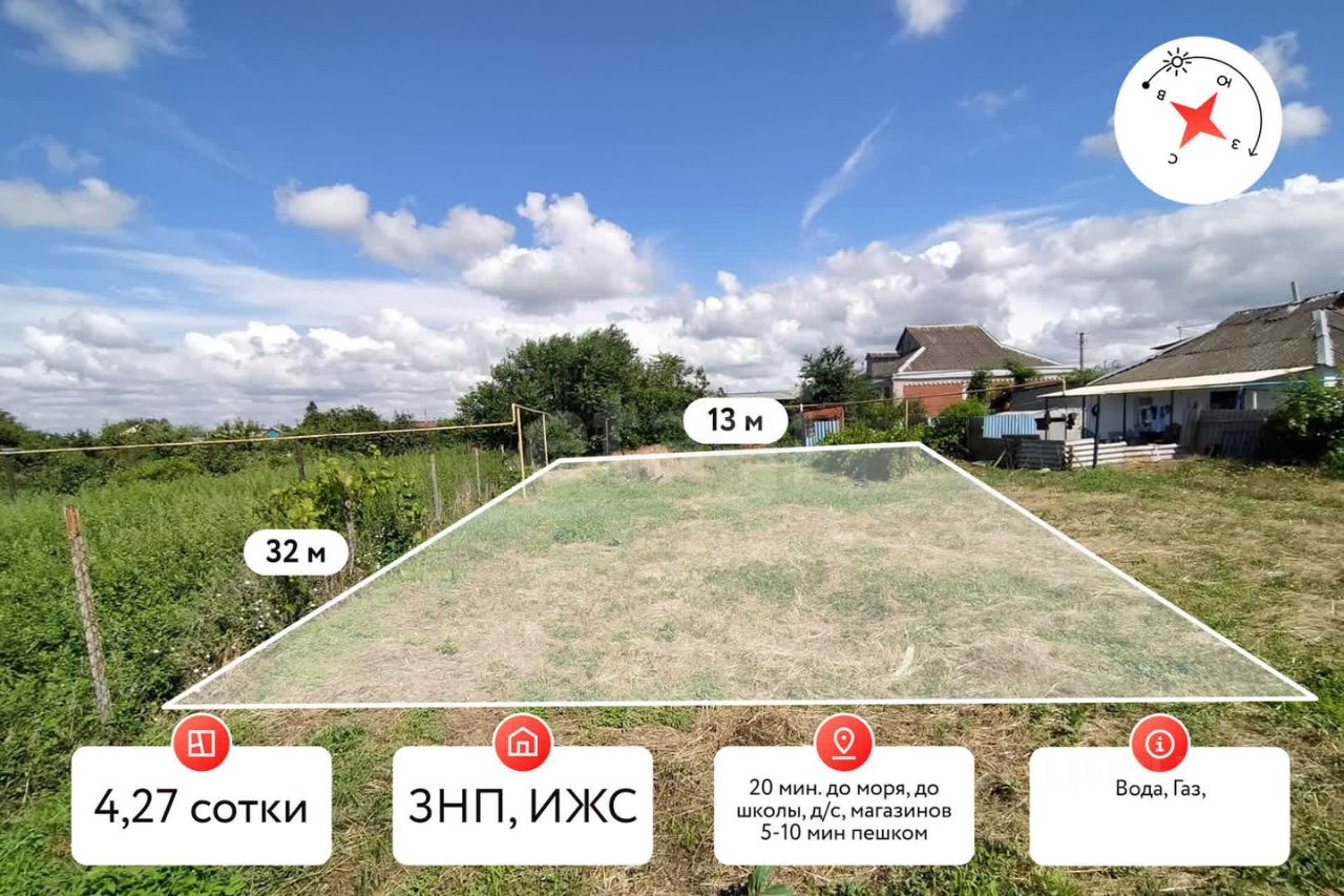 Продается земельный участок ИЖС площадью 4,27 сот., по фасаду 13 м, в глубину 32 м., для строительства индивидуального жилого дома, в развитой станице Курчанская, всего в 20 мин. езды от Азовского моря.