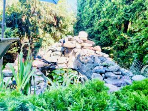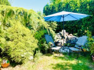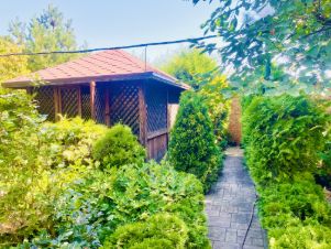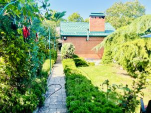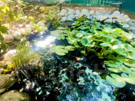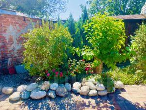 Особую атмосферу участку придает пруд с карпами кои, экзотическими рыбками, которые завораживают своими яркими красками. Фруктовые деревья - черешня, персики, инжир, малина, смородина и клубника - обеспечат вас свежими плодами и ягодами в течение всего сезона. Огромное количество редких цветов превращают сад в настоящий райский уголок.