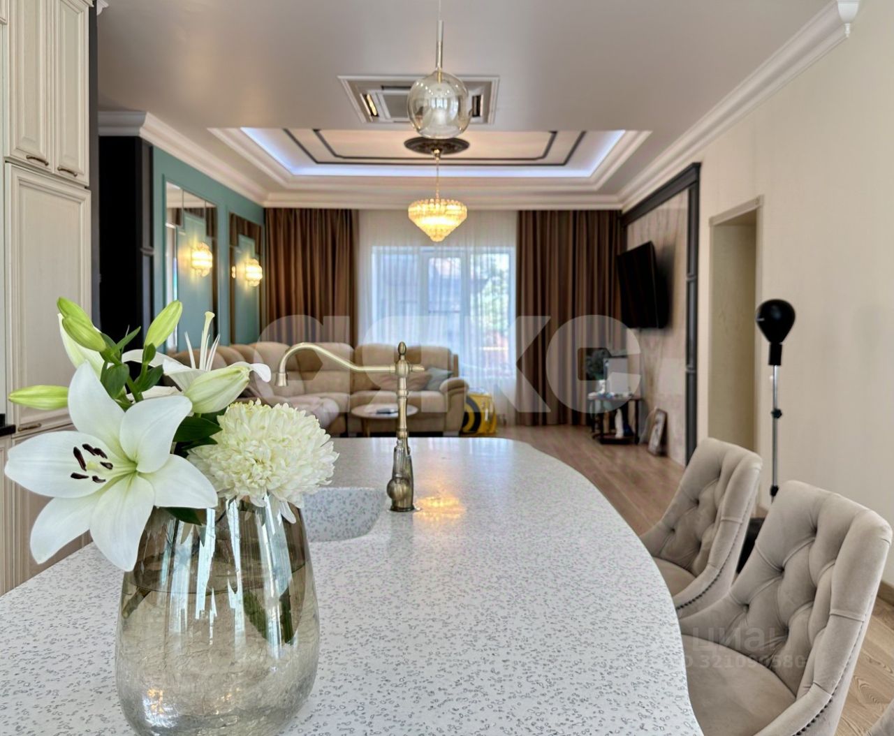 Просторная кухня-гостиная с обеденной зоной, сочетающая в себе элегантность и функциональность.