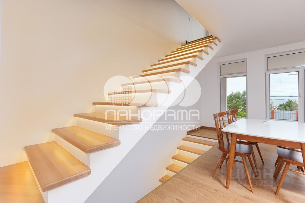 - Первый этаж включает просторную прихожую и стильную кухню-гостиную с панорамным остеклением, откуда открывается живописный вид на сад и лиман.