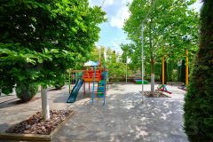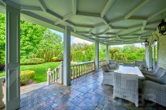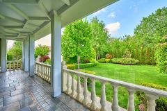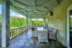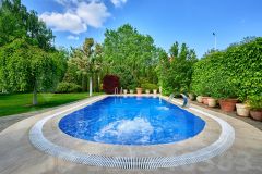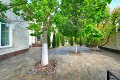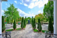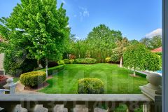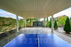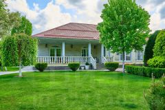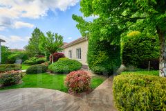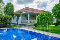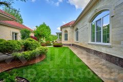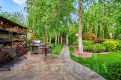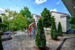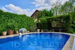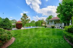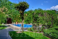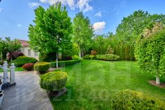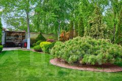 Ландшафтный дизайн с редкими растениями, автоматическим поливом и уютной баней. Также во дворе: вольер для собак, зона отдыха и бассейн премиум-комплектации с противотоком, подогревом, гейзером, УФ и гидролизной очисткой.
